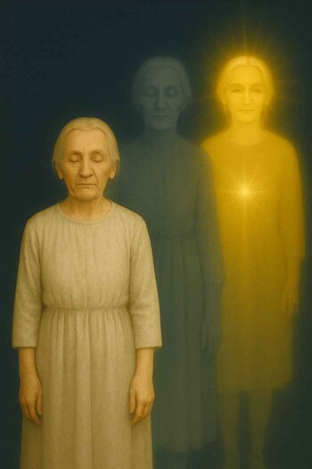 der feinstoffliche Körper tritt aus ihm heraus und erscheint jung und freudig.